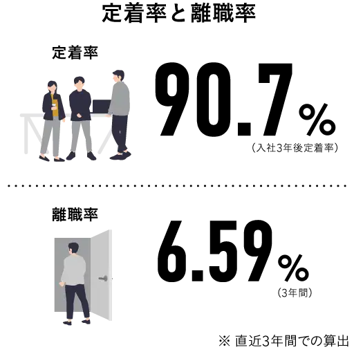 定着率は90.7%と高い水準、離職率は6.59%と低い水準を保っています。